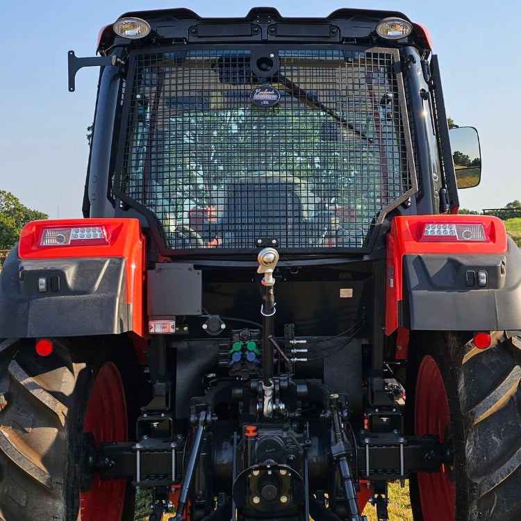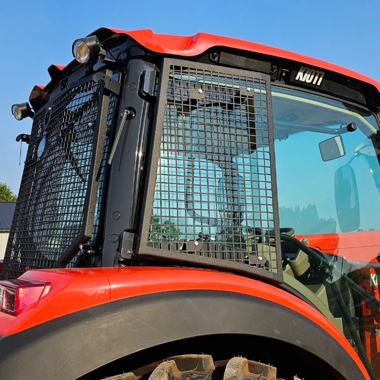 Some cab cages come with rear lower window screens. These screens can be mounted by lining the screen up with the window and drilling 4 holes using self-tapping screws. This is the only part of the cage that requires modification to the tractor.